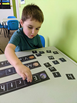 This week one of the activities in our Space and Sky curriculum from Experience Early Learning was called Planet Word Builders. With this activity they practiced alphabetic knowledge and classification. We worked to build three planet names: Earth, Mars, and Venus. I cut up the letter cards and laid them next to the word strips, randomly. We did this activity individually so that I could really see what letters they were able to identify.